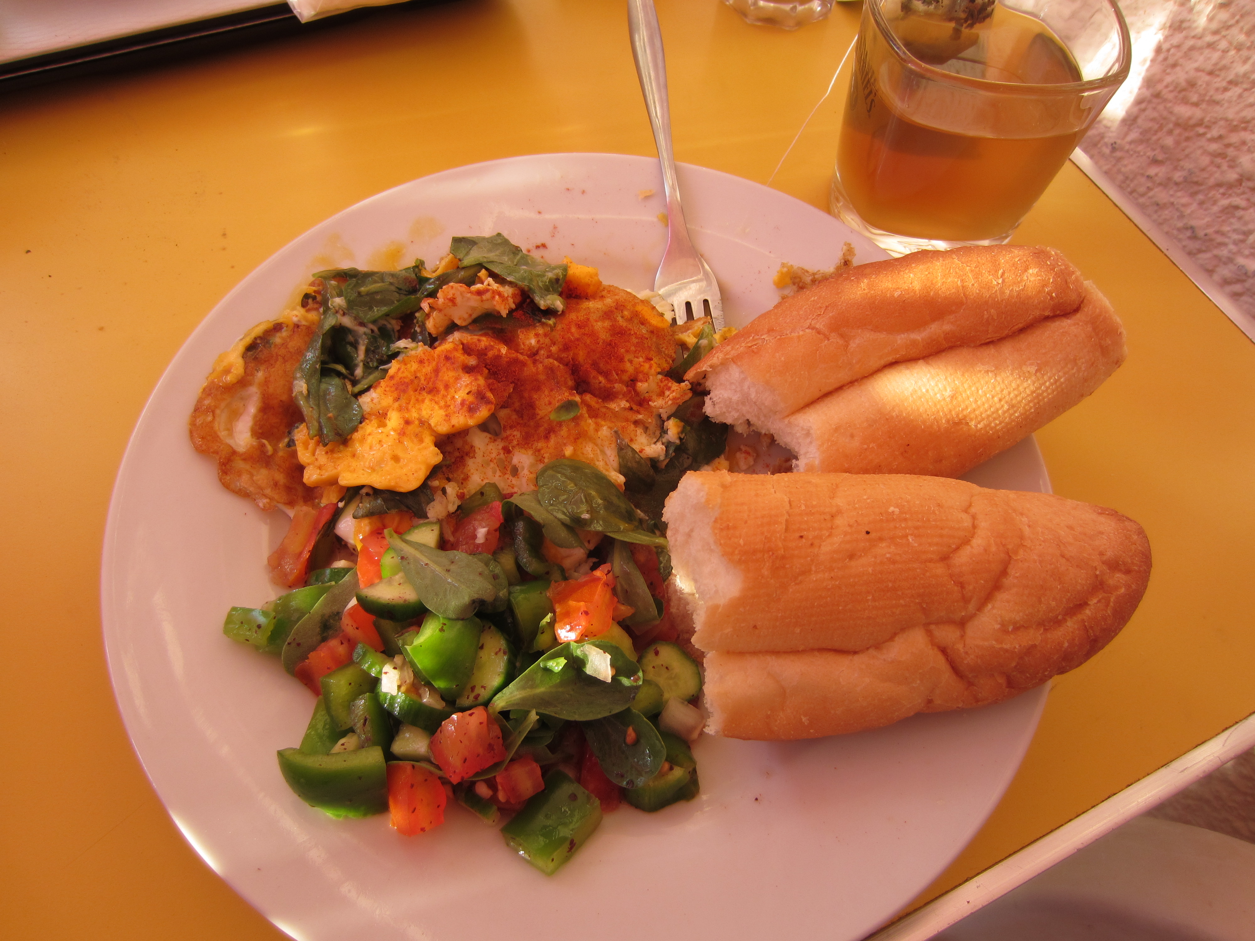 My friend Joe introduced me to a simple, healthy dish that I’ve seen called either hindbe or khobbeizeh bel zeit. The second name defines the dish: khobbeizeh being the word for dandelion leaves, zeit being oil. The leaves are boiled and served with oil, garlic, lemon juice, and fried onions on top. You could eat it with a fork, but it’s even better just scooped up in some pita bread. I also feel like you could do this dish with many varieties of leafy green (chard, spinach, etc.) (see below), but the use of dandelion is what makes this food authentically and particularly Lebanese.