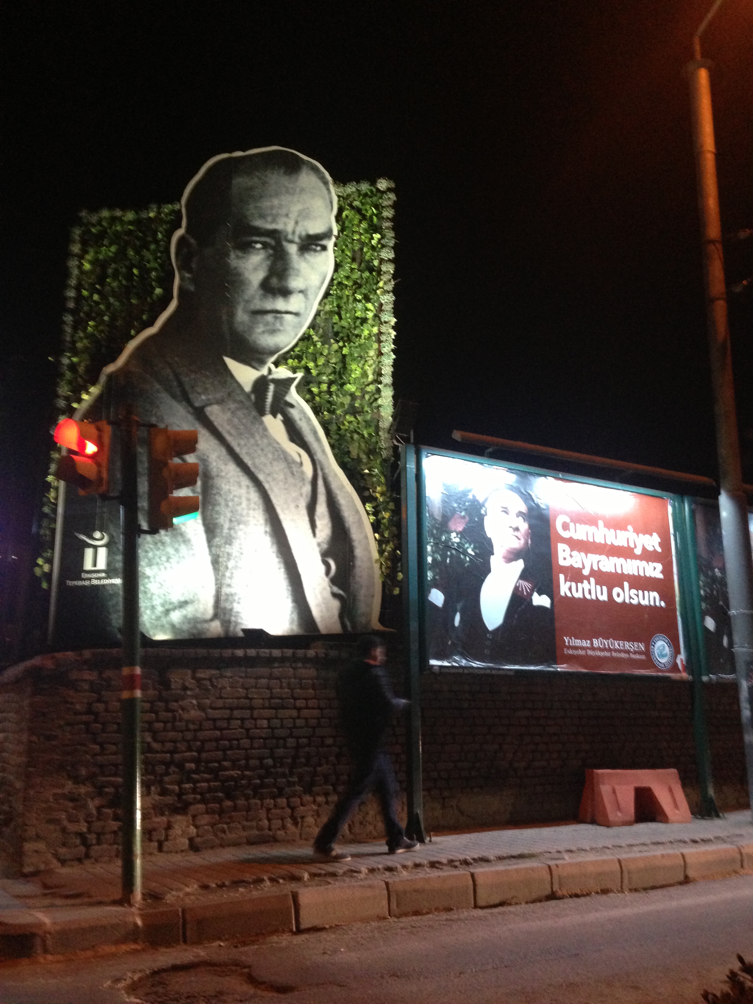 In the morning I went with my roommate to purchase a flag for us to display from our balcony- it was important for her to express her pride in the Republic through this gesture. Though flags and Ataturk’s image are displayed throughout the year in some/many places (particularly at government establishments, like my public university, where Ataturk’s image is displayed in each classroom, my office, at the entrance to the building, in a statue outside the building, at the university gates, etc.) on Republic Day a Turkish flag was hung at the entrance of nearly every shop in the city center, from windows and apartment balconies as well.
